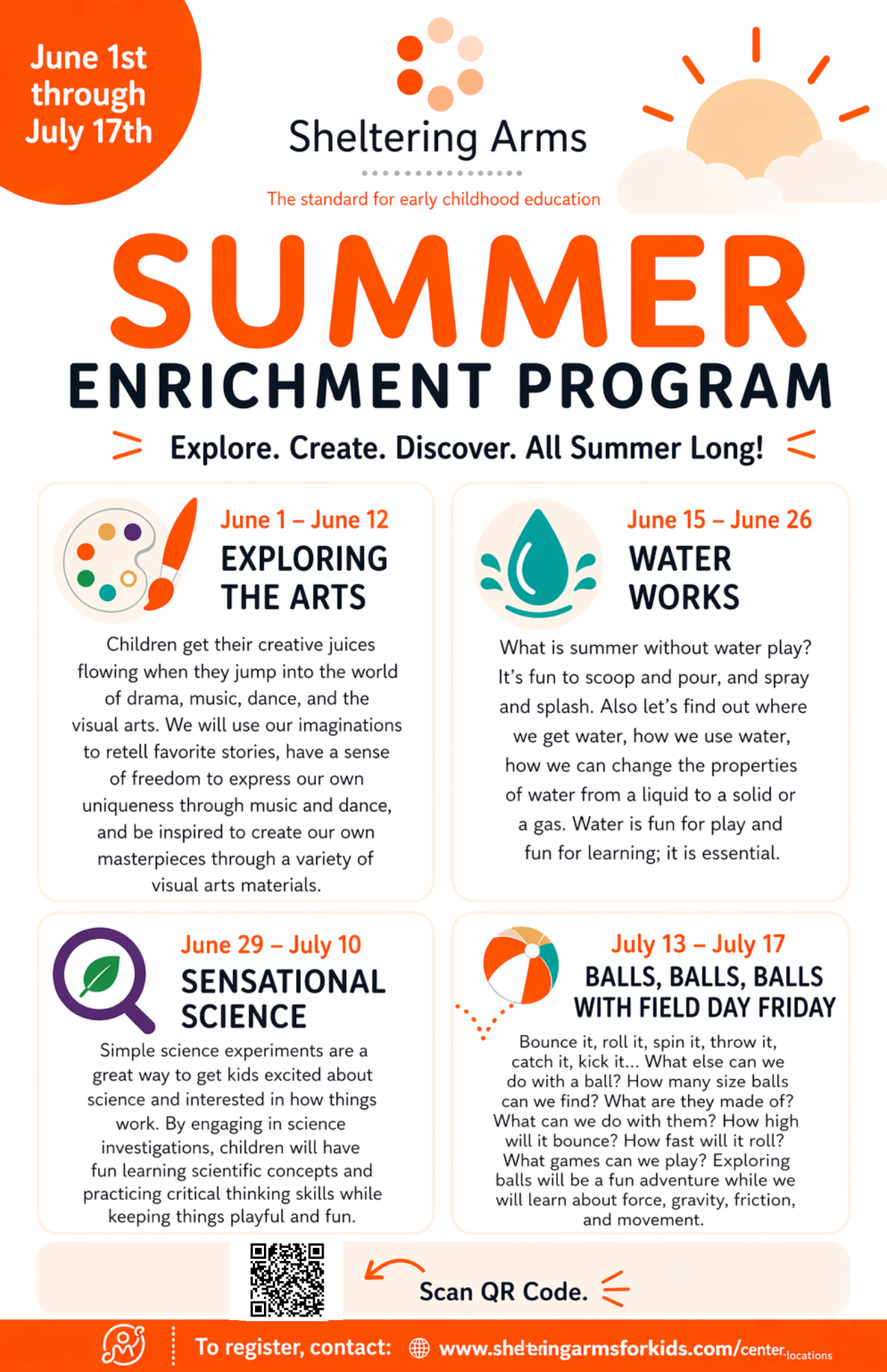 It's almost summer camp season! Our Sheltering Arms Summer Enrichment Program starts June 1st! This exciting program will ignite your child's creativity, challenge their thinking, and provide opportunities to explore, learn, and play. To register, contact the center director at your desired location.