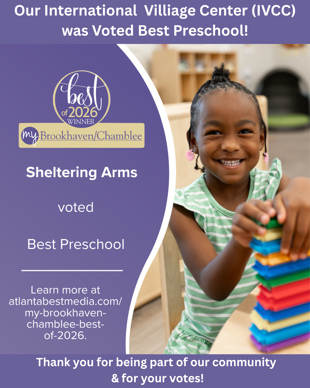 IVCC has been named Best Preschool in Brookhaven/Chamblee! This recognition highlights the center’s commitment to high-quality early education, nurturing environments, and strong family partnerships. It reflects the meaningful impact IVCC has on children and families each day and the vibrant community that supports its continued success.