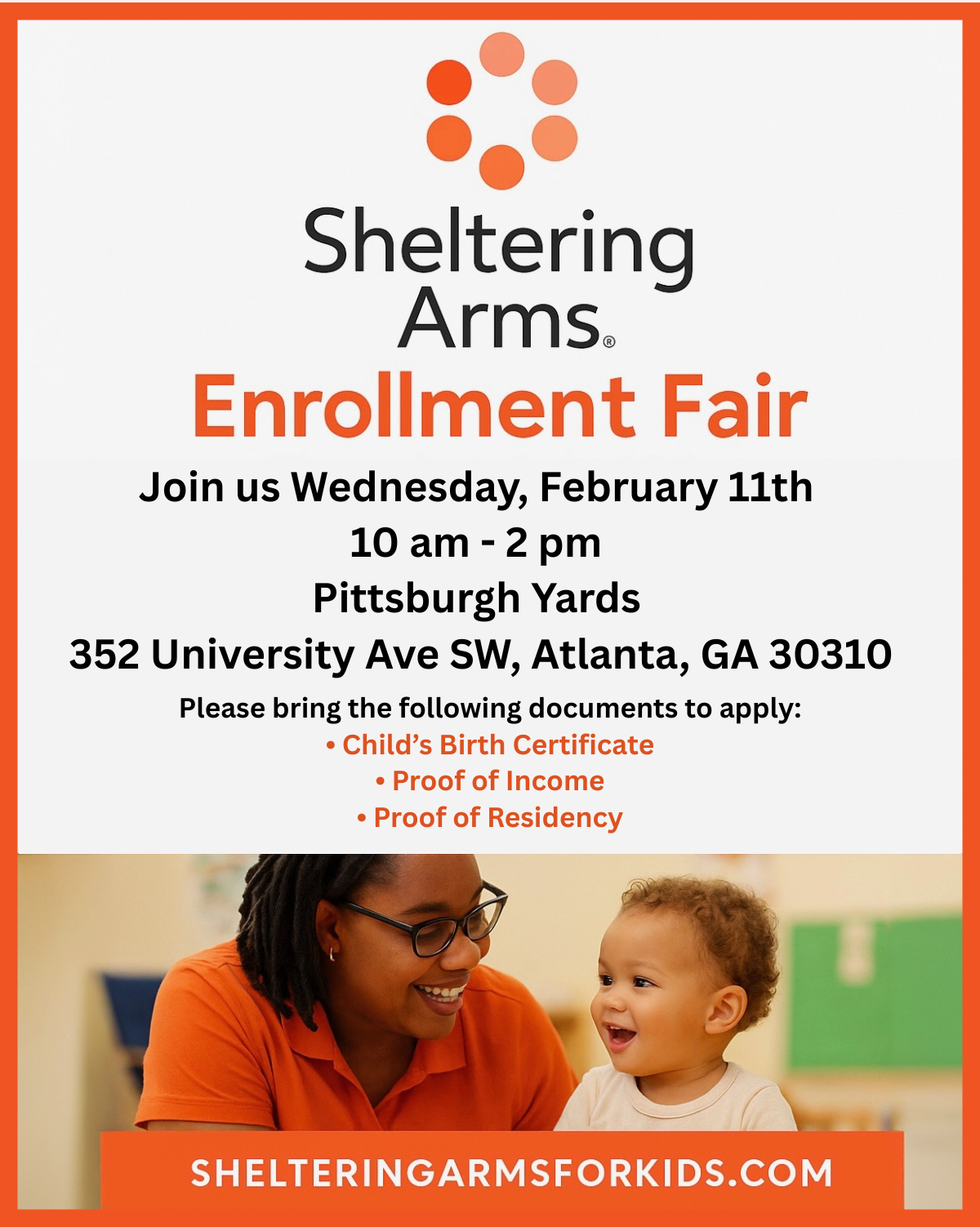 This is critical moment for Sheltering Arms and the 2,100 children and families we serve across the metro Atlanta area. Like many early education providers, we are facing unprecedented challenges due to the “childcare cliff” that threaten our ability to deliver the high-quality care and education our children deserve. We are taking decisive action to protect what matters most, our classrooms, teachers and the families who depend on us. Now more than ever, your gift can make a lasting impact. Please consider investing in the future of Atlanta’s children. Together, we can create the foundation they need to thrive. Thank you for your support!